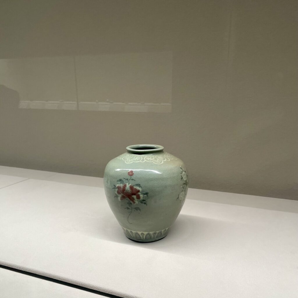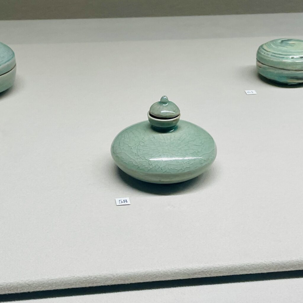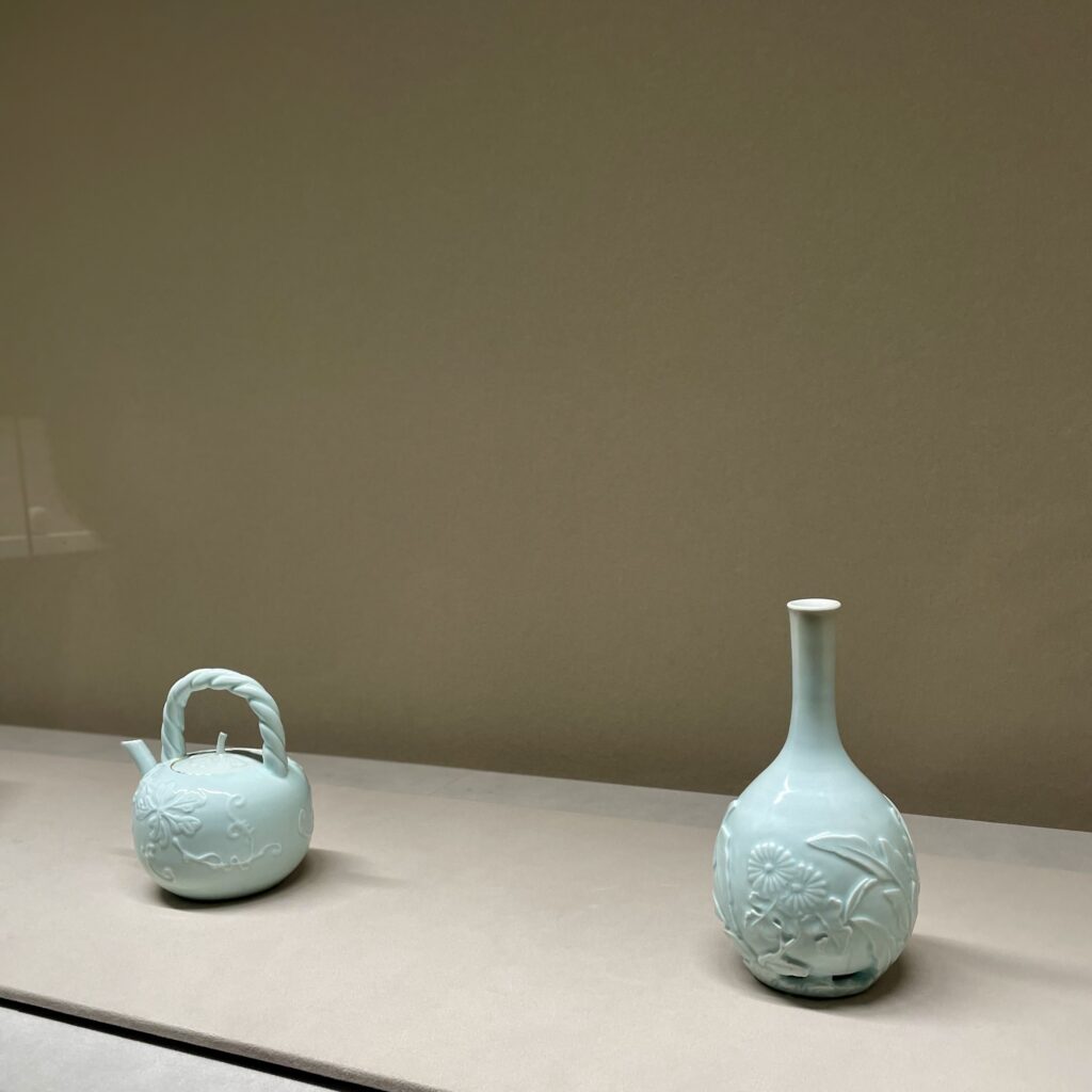 L’exposition était consacrée au céladon. Le céladon est une céramique à glaçure bleu-vert née en Chine au IIᵉ siècle. Sa couleur si particulière provient d’une glaçure contenant un peu de fer et d’une cuisson à très haute température. Elle varie subtilement selon le four, l’atmosphère de cuisson ou l’argile utilisée, ce qui donne des pièces toutes différentes.